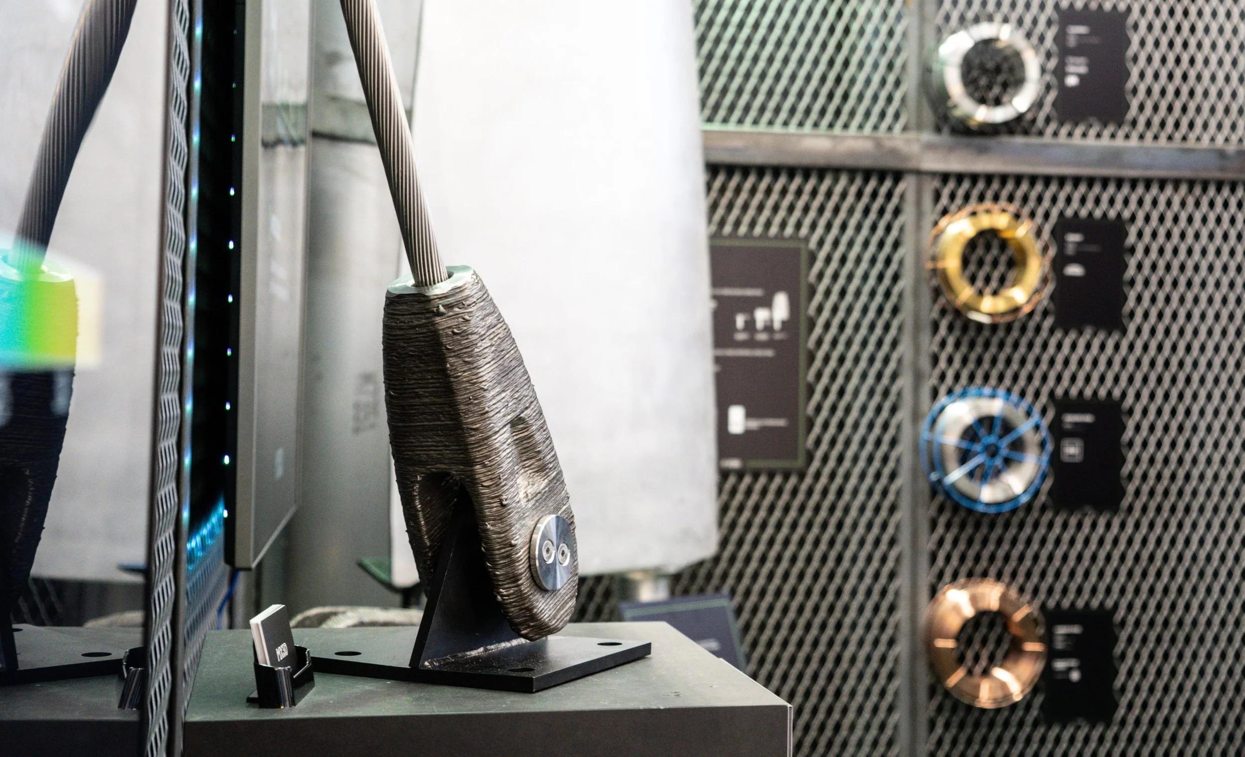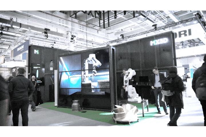 Walking into the booth evoked the sensation of watching a WAAM system in action. Visitors to MX3D’s stand in 2022 found themselves walking through an arena of equipment housed in steel walls made of welded industrial piping and expanded mesh; all of which was illuminated by neon or flashes of welding videos on a massive video wall.